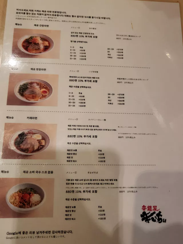 가기 전에 후기에 알바가 불친절하다는 후기가 있었는데 성격이 원래 무뚝뚝하신 것 같아요. 걱정하지 마시고 매운 라멘 드시고 싶다면 한 번쯤 방문해 보시길 추천드립니다.