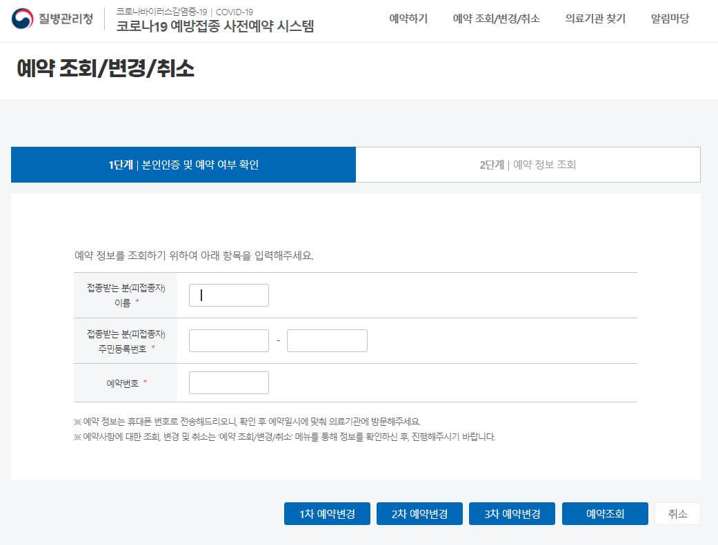 - 접종자 이름, 주민등록번호, 예약번호 입력 후 예약 일정 변경