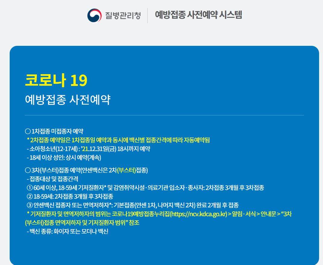 코로나 19에 이어 델타, 오미크론 계속된 변이 바이러스가 거듭되면서 확산세가 끊임없이 이어지고 있습니다. 확산세를 막기 위해 당국은 부스터샷 접종 간격을 3개월로 단축하였고, 12월 13일부터 본격적으로 부스터샷 예약이 진행되고 있습니다. 그럼 바로 예약방법 및 예약 일정, 시간 변경 및 접종 대상에 대해 알아보겠습니다.