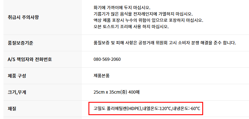 참고사항으로 대표적인 위생봉투 및 랩 제조사인 (주)cleanlab 에서는 내열온도를 크린백 120도, 크린랩 100도로 권장하고 있습니다.