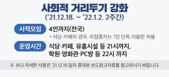 정부가 12월 18일 0시부터 사회적 거리두기를 강화하기로 발표하였고 이에 따라 결혼식, 장례식장 인원 제한도 변경되었습니다. 강화된 거리두기는 12월 18일부터 내년 1월 2일까지 시행되는데요. 시행기간 동안 수도권·비수도권 상관없이 사적 모임 인원을 최대 4인까지 허용하고, 전국 공통으로 영업시간이 9시·10시로 제한됩니다. 그럼 바로 살펴보겠습니다.